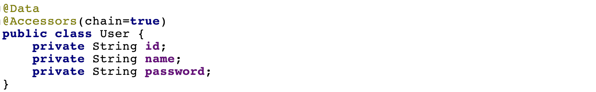 1 2 3 4 5 6 7 @Data @Accessors(chain=true) public class User {private String id;private String name;private String password; }