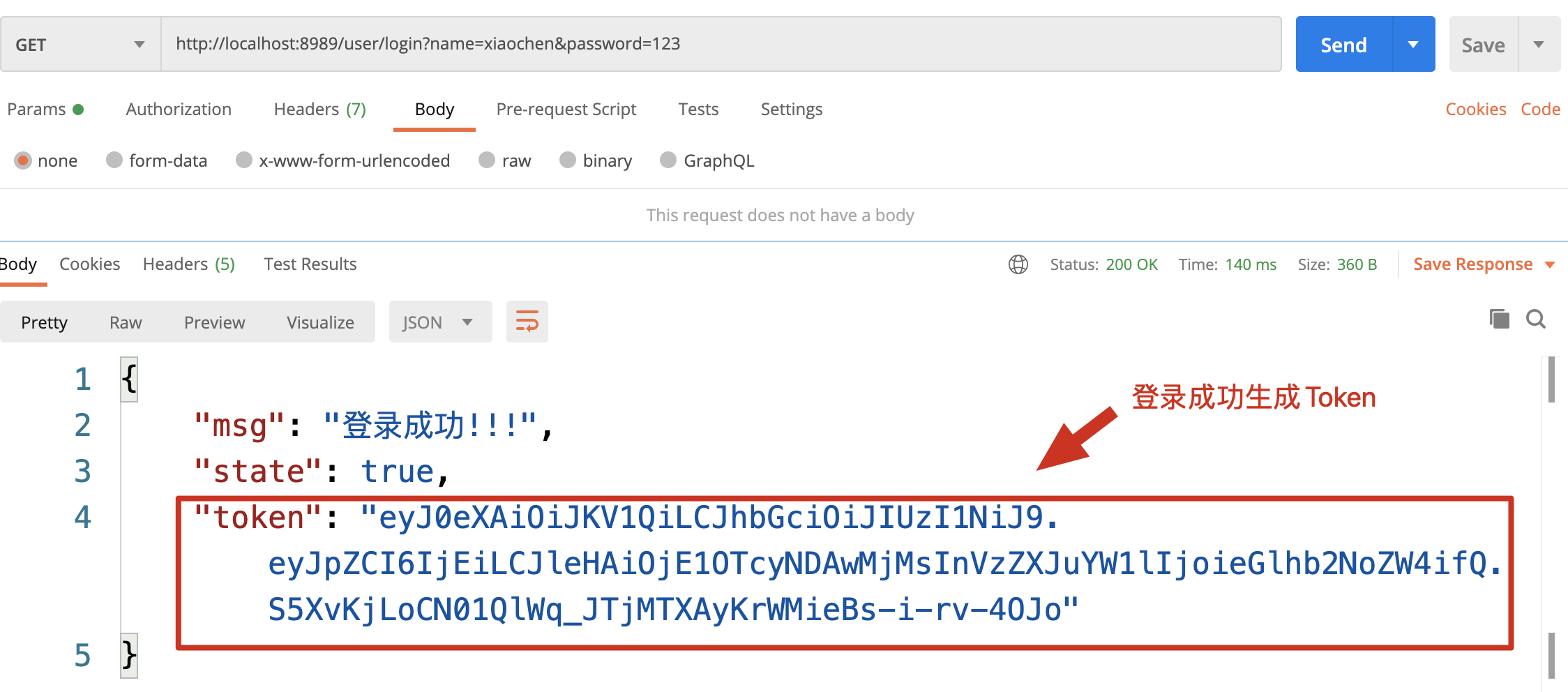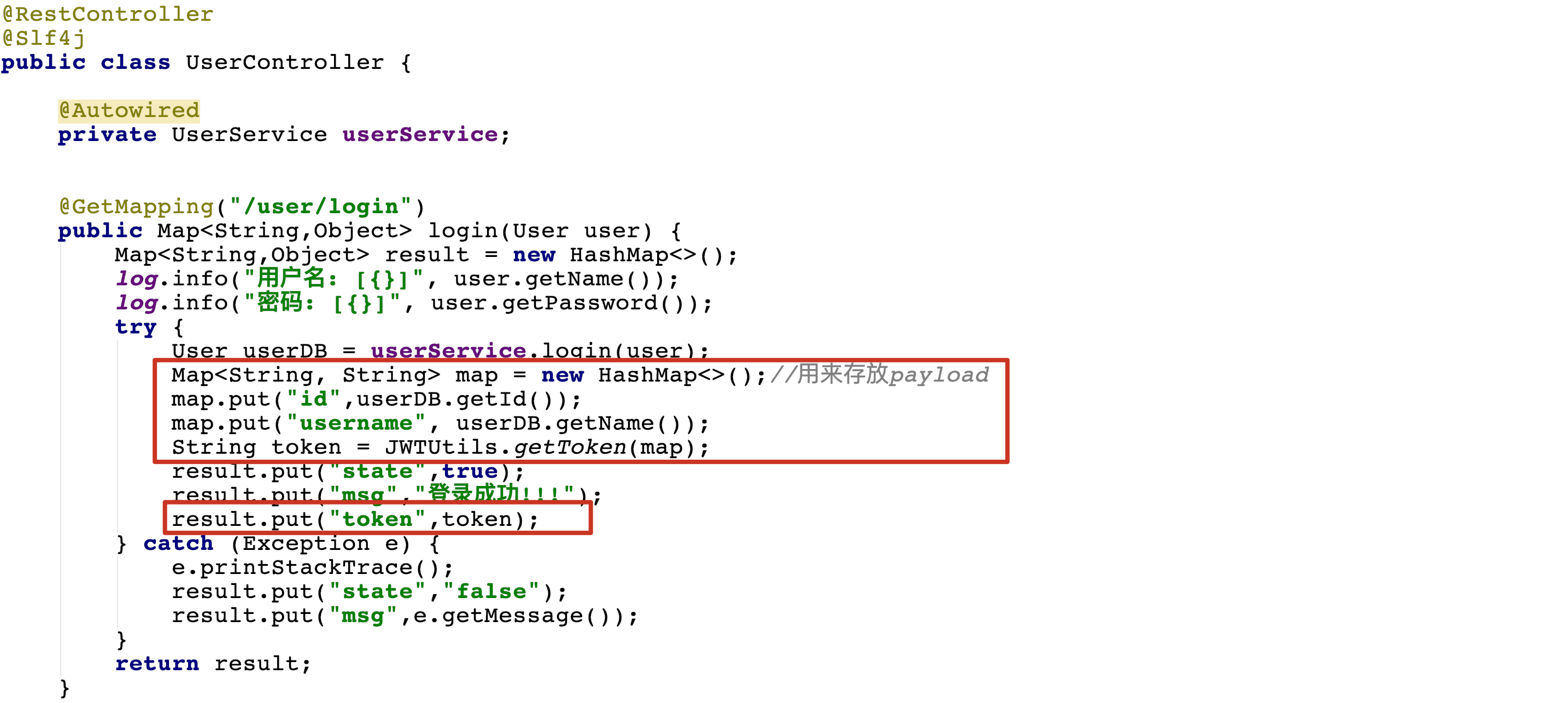 1 2 3 4 5 6 7 8 9 10 11 12 13 14 15 16 17 18 19 20 21 22 23 24 25 26 27 @RestController @Slf4j public class UserController {@Autowired private UserService userService;@GetMapping("/user/login") public Map<String,Object> login (User user) { Map<String,Object> result = new HashMap <>(); log.info("用户名: [{}]" , user.getName()); log.info("密码: [{}]" , user.getPassword());try {User userDB = userService.login(user); Map<String, String> map = new HashMap <>(); map.put("id" ,userDB.getId()); map.put("username" , userDB.getName());String token = JWTUtils.getToken(map); result.put("state" ,true ); result.put("msg" ,"登录成功!!!" ); result.put("token" ,token); } catch (Exception e) { e.printStackTrace(); result.put("state" ,"false" ); result.put("msg" ,e.getMessage()); }return result; } }