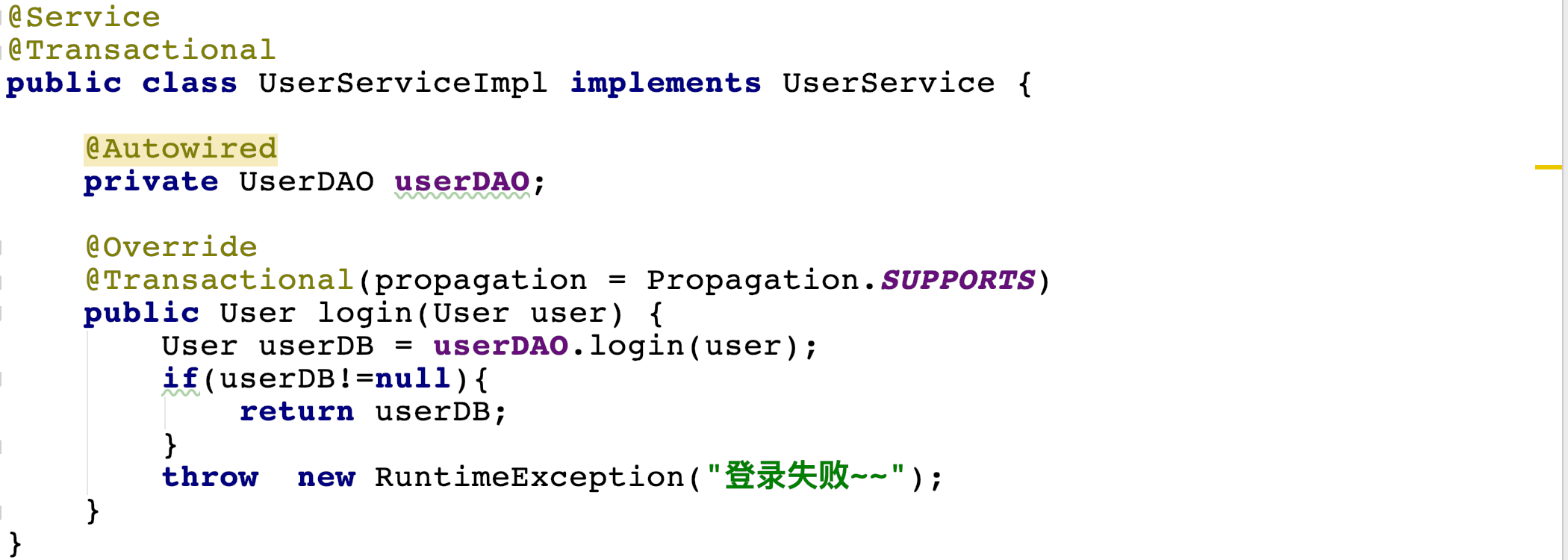 1 2 3 4 5 6 7 8 9 10 11 12 13 14 15 @Service @Transactional public class UserServiceImpl implements UserService {@Autowired private UserDAO userDAO;@Override @Transactional(propagation = Propagation.SUPPORTS) public User login (User user) {User userDB = userDAO.login(user);if (userDB!=null ){return userDB; }throw new RuntimeException ("登录失败~~" ); } }