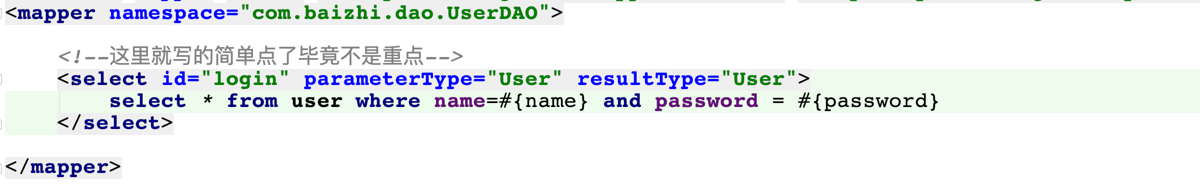 1 2 3 4 5 6 <mapper namespace ="com.baizhi.dao.UserDAO" > <select id ="login" parameterType ="User" resultType ="User" > select \* from user where name=#{name} and password = #{password}</select > </mapper >