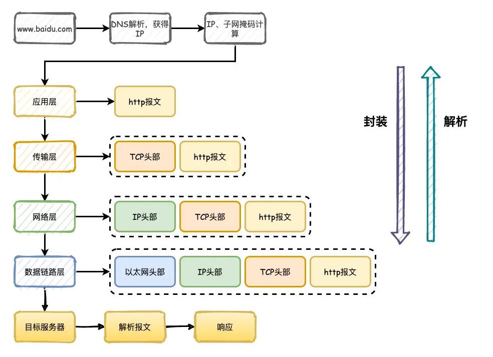 - 构造应用层请求http报文,传输层添加TCP/UDP头部,网络层添加IP头部,数据链路层添加以太网协议头部