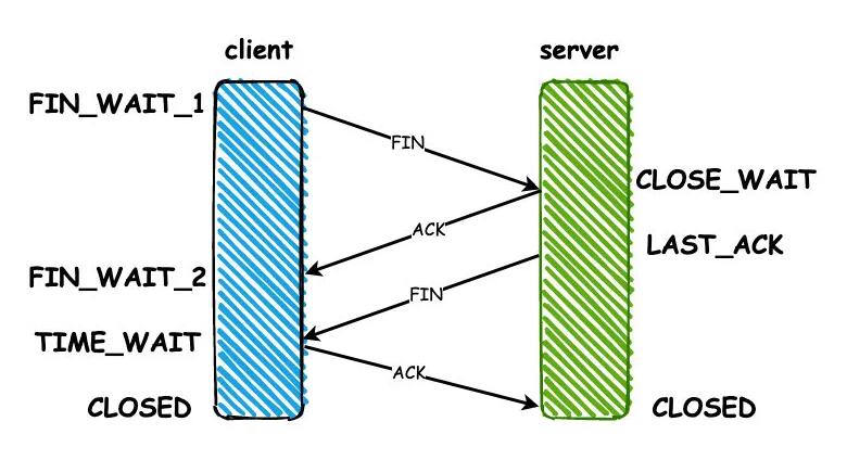 - client收到ACK之后,进入TIME_WAIT的状态,同时回复ACK,server收到之后直接进入CLOSED状态,连接关闭。但是client要等待2MSL(报文最大生存时间)的时间,才会进入CLOSED状态。